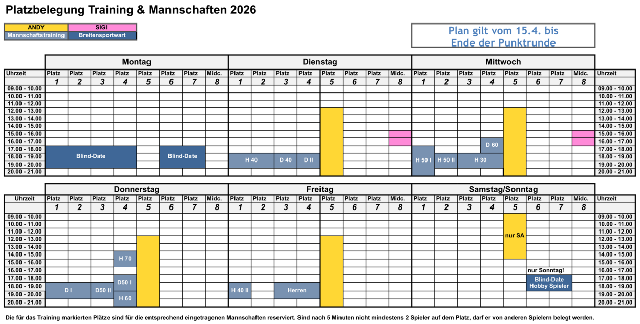 Dann sind durch die Heimspiele unserer Mannschaften häufig Plätze vorreserviert. Diese Punkspiele haben bei der Durchführung immer Vorrang! Wir bemühen uns kurzfristig Plätze im System frei zu geben, bzw Reservierungen nicht unnötig im Voraus auszudehnen. Kommt zum Zuschauen, nutzt kurzfristig die freien Plätze, bitte habt Verständnis für nötige Planänderungen (z.B. wegen des Wetters).